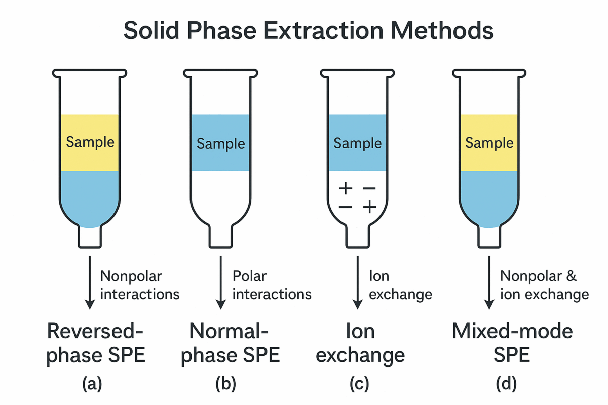 Figure 1: (SPE) methods—Reversed-phase, Normal-phase, Ion exchange, and Mixed-mode SPE.