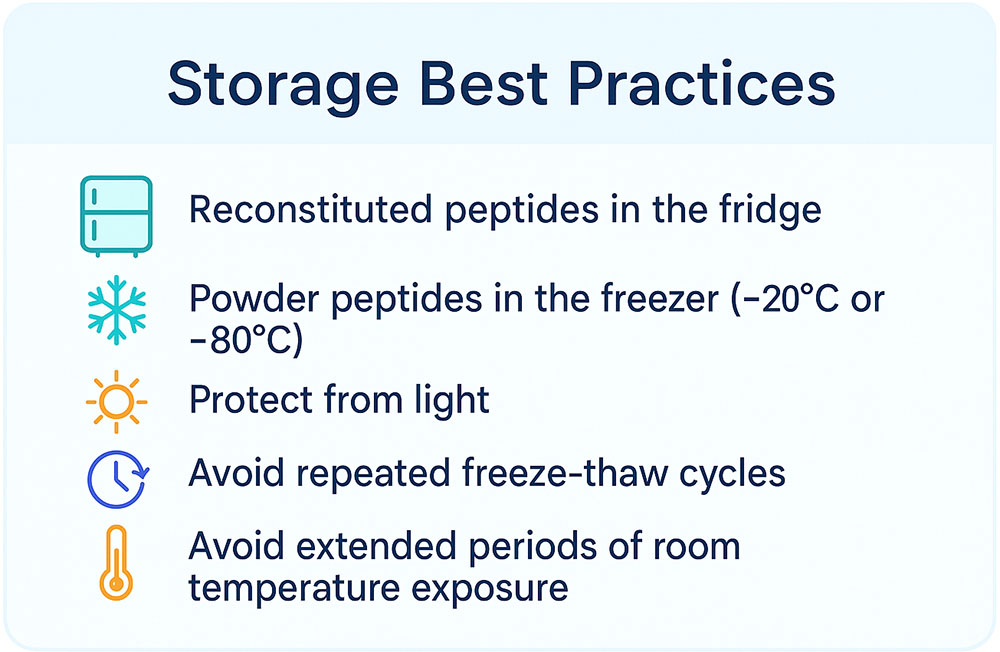 - Store in powder form in the freezer and reconstituted peptides in the fridge. Use airtight containers with desiccants or inert gas, minimize light exposure, and aliquot to reduce handling.
