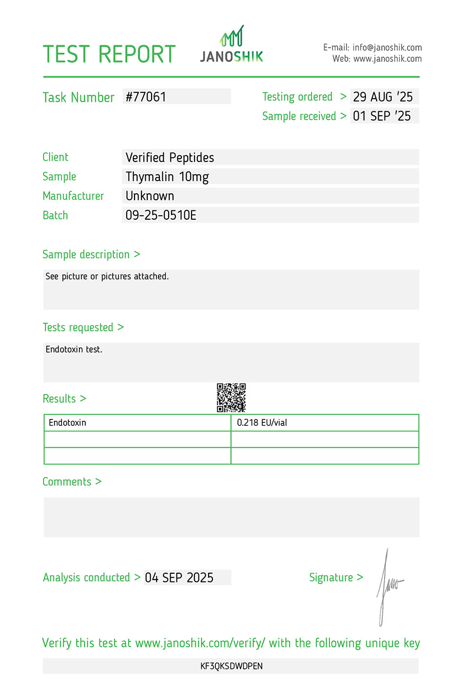 Epitalon Batch #: | 10-25-0610G |
