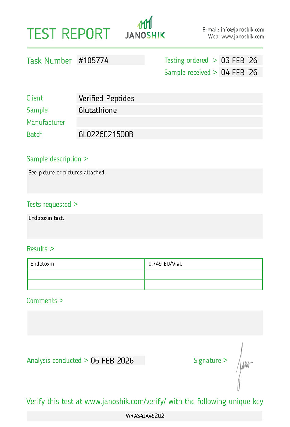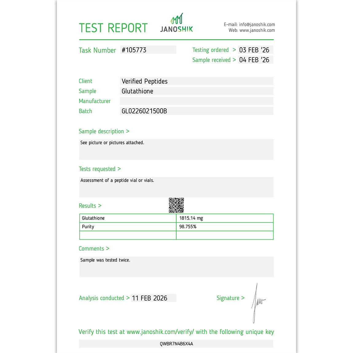 This batch of L-Glutathione has been third party lab tested and verified for quality.
