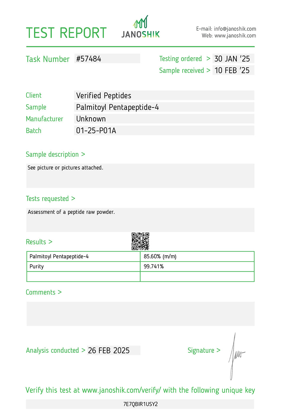 This batch of Palmitoyl Pentapeptide-4 Powder has been third party lab tested and verified for quality.