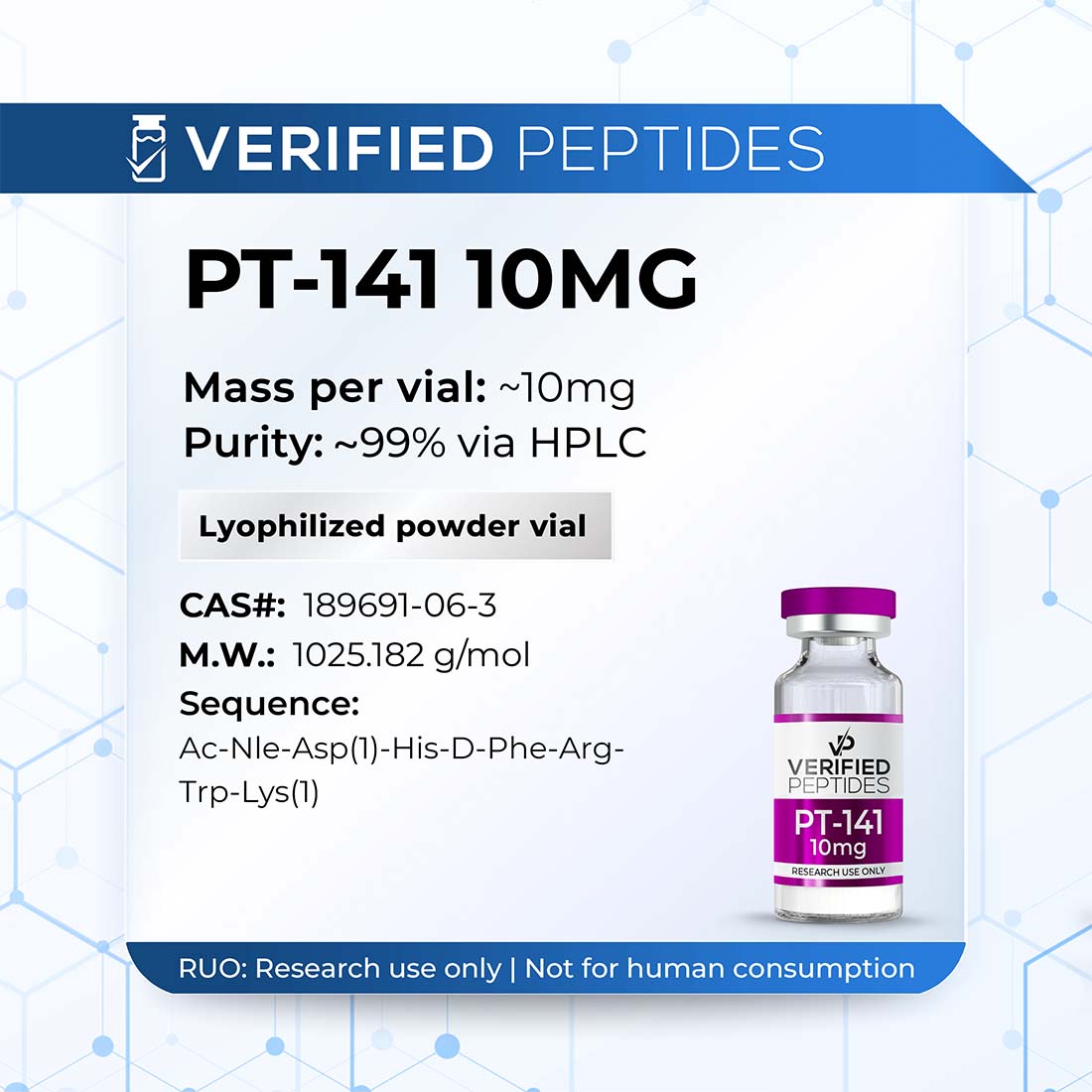 PT-141 is a synthetic peptide analog of α-melanocyte-stimulating hormone (α-MSH) that functions as a melanocortin receptor agonist, with affinity for central melanocortin receptors, particularly MC3 and MC4. These receptors are part of proopiomelanocortin (POMC) signaling systems known to influence motivated behaviors within hypothalamic and limbic circuits. Unlike peripherally acting agents, PT-141 operates through central nervous system pathways, specifically targeting brain regions involved in sexual motivation and desire-related behaviors. This positions PT-141 as a unique research tool for investigating melanocortin-mediated modulation of appetitive sexual behaviors in preclinical models.