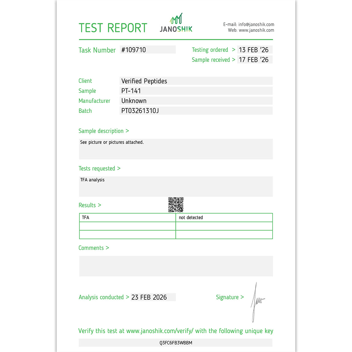 We conduct an array of tests via HPLC and other methods for our peptides: purity, weight, endotoxins(LPS), sterility (bacteria & mold/yeast), and TFA content.