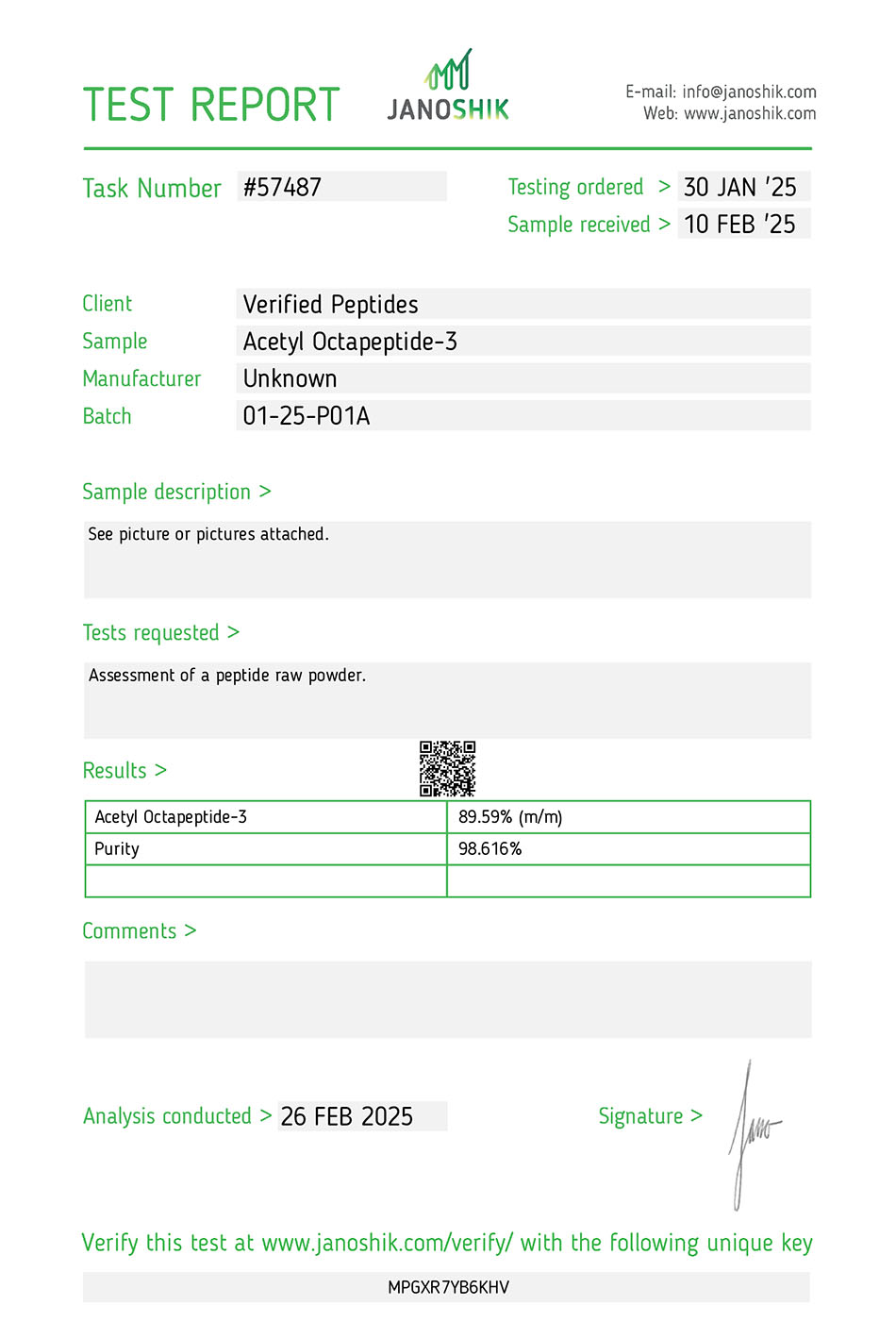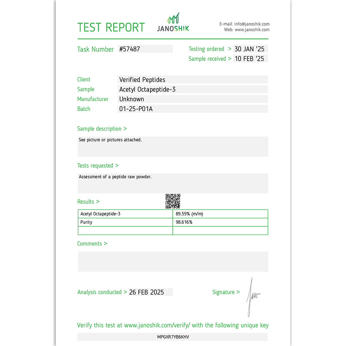 This batch of Acetyl Octapeptide-3 Powder has been third party lab tested and verified for quality.