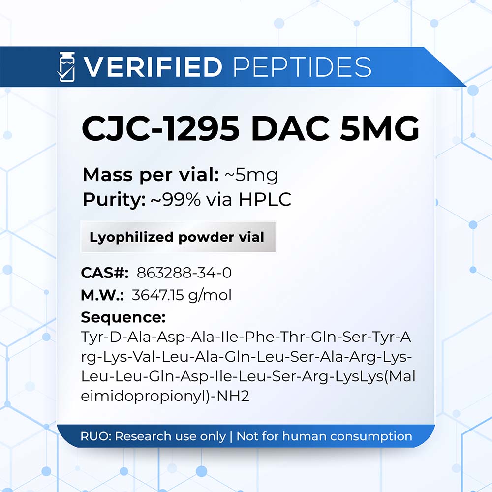 CJC-1295 is a synthetic GHRH analog designed for prolonged biological activity. Unlike traditional short-acting GHRH peptides, CJC-1295 covalently binds to endogenous albumin, forming a drug-affinity complex (DAC) that extends its half-life to match that of albumin. This albumin binding mechanism allows sustained GHRH receptor activation and prolonged GH release. As a long-acting GHRH analog, CJC-1295 represents a new generation of growth hormone–releasing hormone (GHRH) analogs designed to overcome rapid enzymatic degradation and short systemic residence time observed in earlier peptides. Previous CJC-1295 studies in animals showed prolonged elevations in serum GH and IGF-1 after administration, validating its pharmacological design.