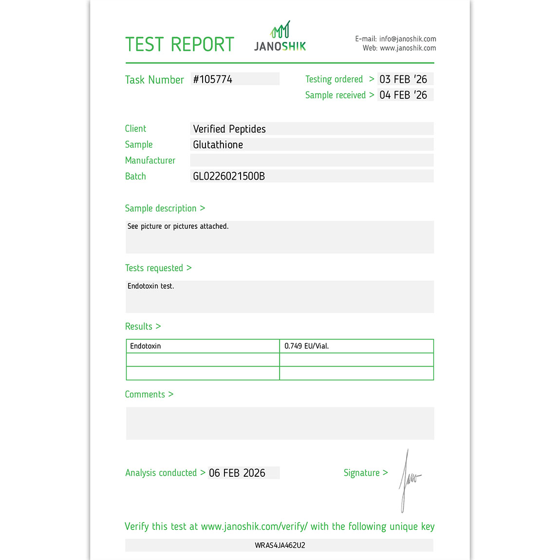 This batch of L-Glutathione has been third party lab tested and verified for quality.